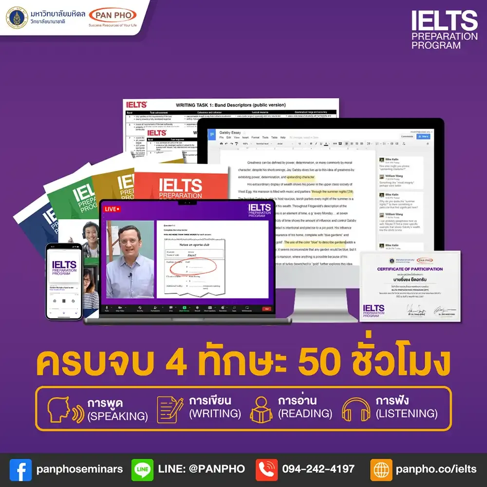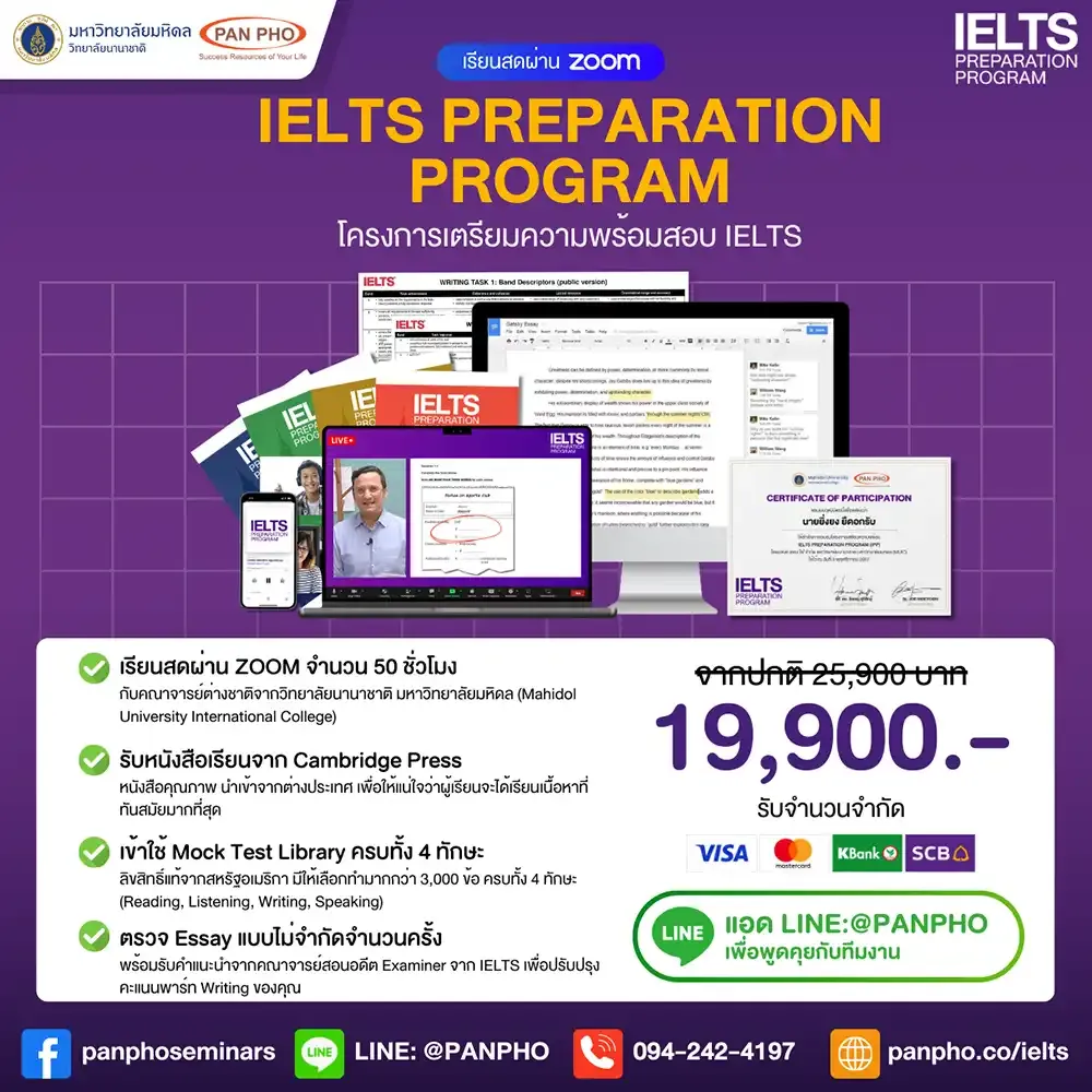 ด่วน! ที่นั่งมีจำนวนจำกัด ผู้ที่สนใจสามารถสมัครและชำระเงินค่าเรียนได้แล้ววันนี้ผ่านทาง Website: www.panpho.co/ielts หรือผ่านทาง LINE: @PANPHO (ตลอด 24 ชั่วโมง) หรือ 094-242-4197
