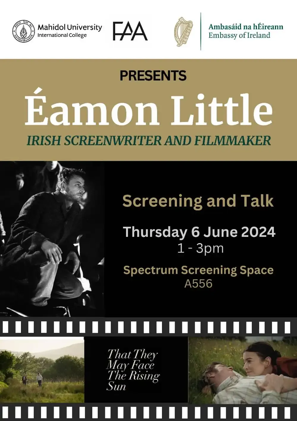 As part of a new initiative of academic and cultural exchange with Ireland at Mahidol University International College (MUIC), the Fine and Applied Arts Division and Film Arts minor, along with the International Affairs Office, recently hosted a film screening and workshop by Irish screenwriter and filmmaker, Éamon Little.