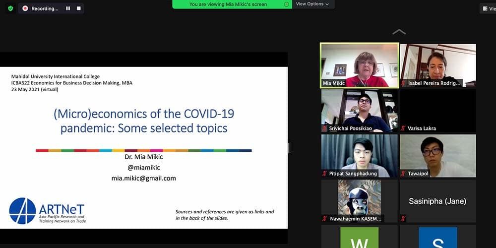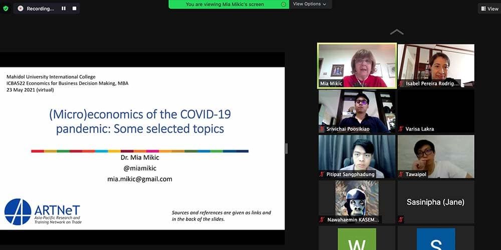 The Master of Business Administration (MBA) Program of Mahidol University International College (MUIC) hosted Dr. Mia Mikic, former Director of the Trade, Investment and Innovation Division of the United Nations Economic and Social Commission for Asia and the Pacific (UNESCAP) as guest speaker on May 23, 2021 for the course on Economics for Business Decision Making, conducted by Dr. Isabel Pereira Rodrigues.