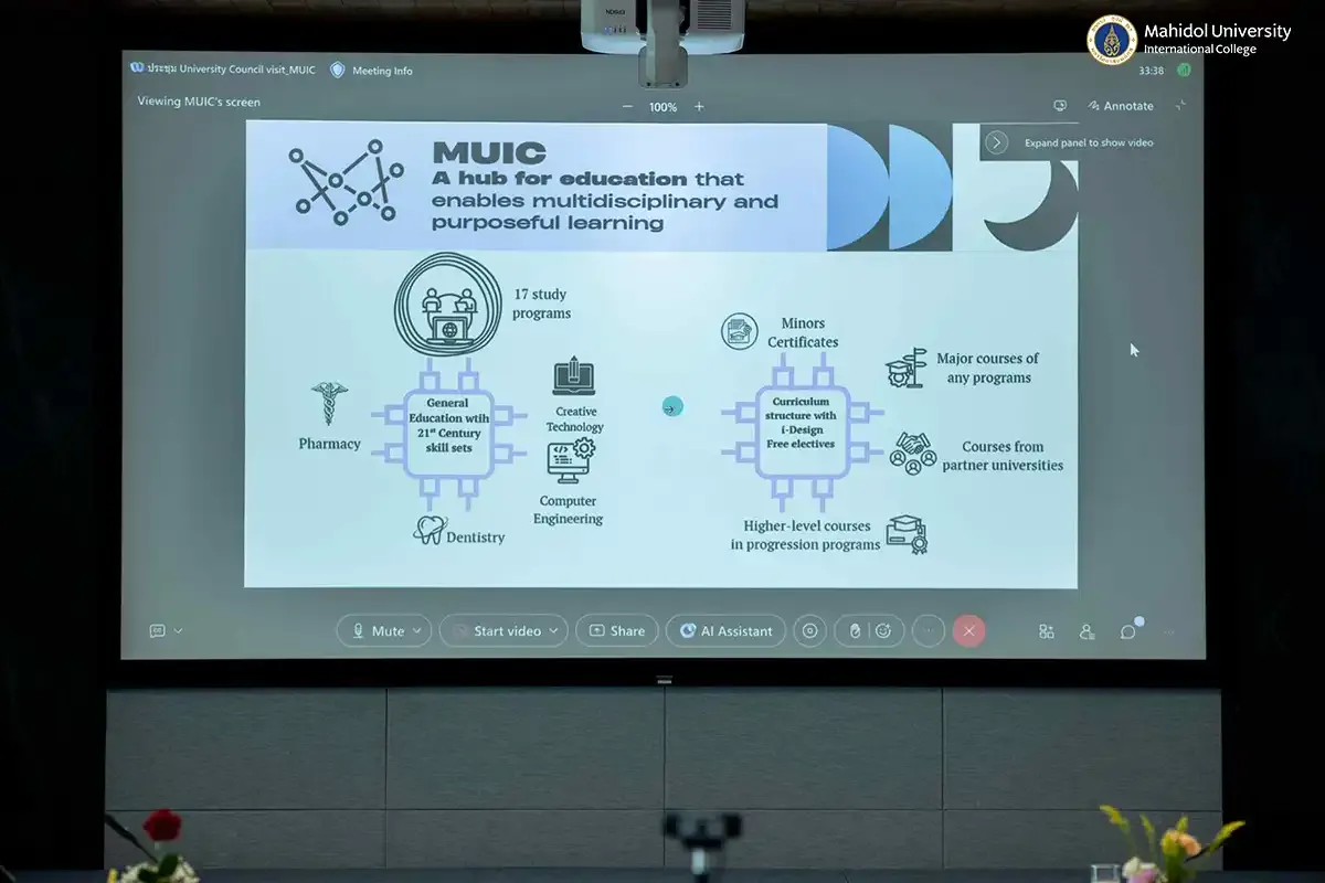 After welcoming the guests at Charinyarasami Hall, 3rd Floor, Aditayathorn Building, the MUIC team gave a presentation of the college’s policies and performance entitled, “MUIC: A Hub for Multidisciplinary Collaboration.”