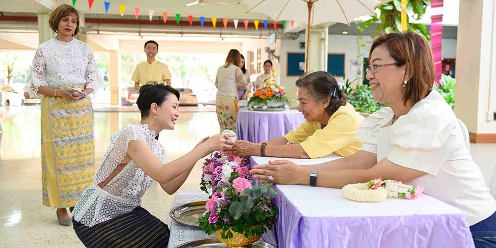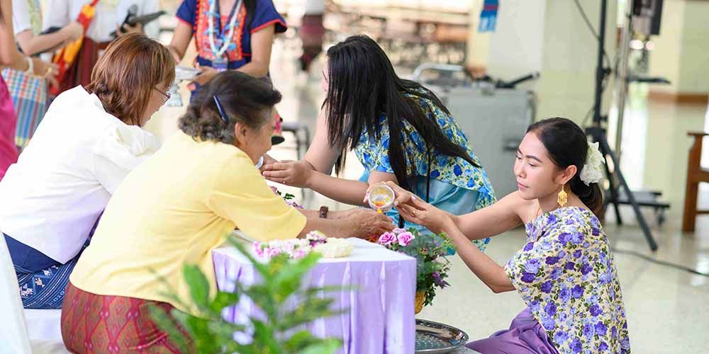 There were many Thai traditional activities such as the bathing rite of the Buddha image (“Song Nam Phra”), pouring of sacred water on the hands of Prof. Chulathida Chomchai, M.D., MUIC Dean, and Professor Emeritus Dr. Chariya Brockelman, former Dean (“Rod Nam Dam Hua”), and receiving the Thai New Year’s Eve blessing from them, and a costume contest featuring traditional clothes of Thailand’s four regions.