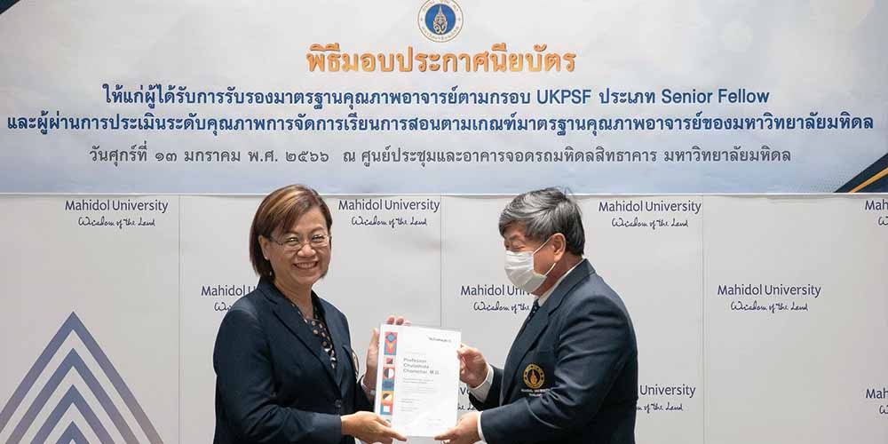 In a ceremony held on January 13, 2023 at Prince Mahidol Hall in Mahidol University’s (MU) Salaya campus, Prof. Banchong Mahaisavariya, M.D., MU President, awarded the United Kingdom Professional Standards Framework (UKPSF) Senior Fellow certificates to Prof. Chulathida Chomchai M.D., MUIC Dean, and Asst. Prof. Dr. Alexander Nanni, Associate Dean for International Affairs.