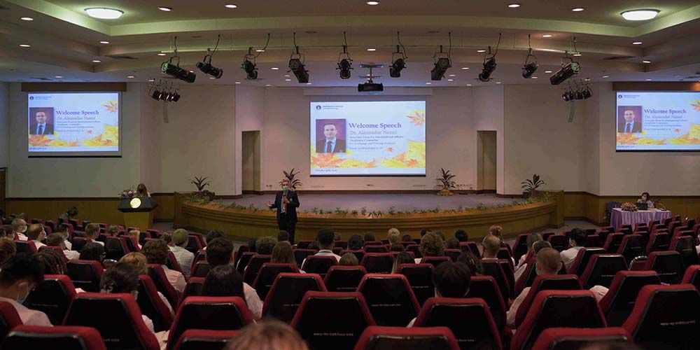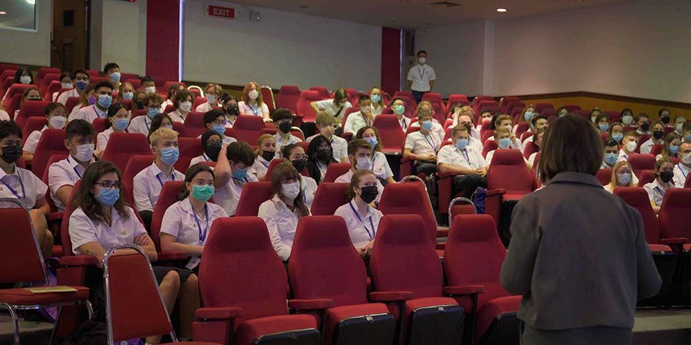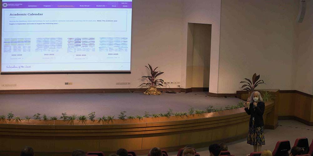 Prof. Chulathida Chomchai, MD, MUIC Dean, gave the welcome speech and provided general information on how to stay safe and healthy while studying in Thailand.