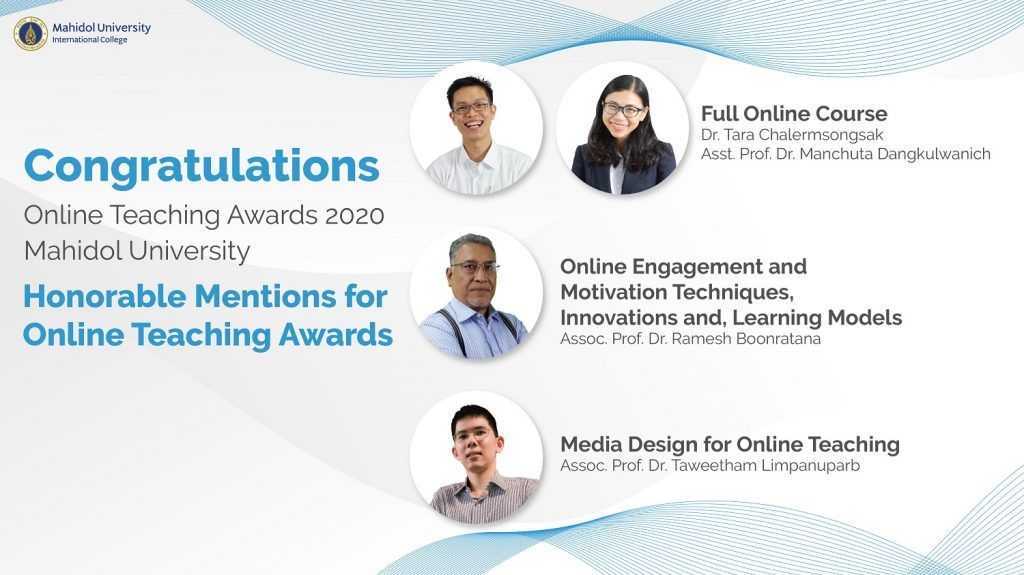 The Online Teaching Award is given by Mahidol University in recognition of instructors who showed efficient performance and for successfully motivating others to learn and develop the online Teaching Program during the 2020-2021 academic year.