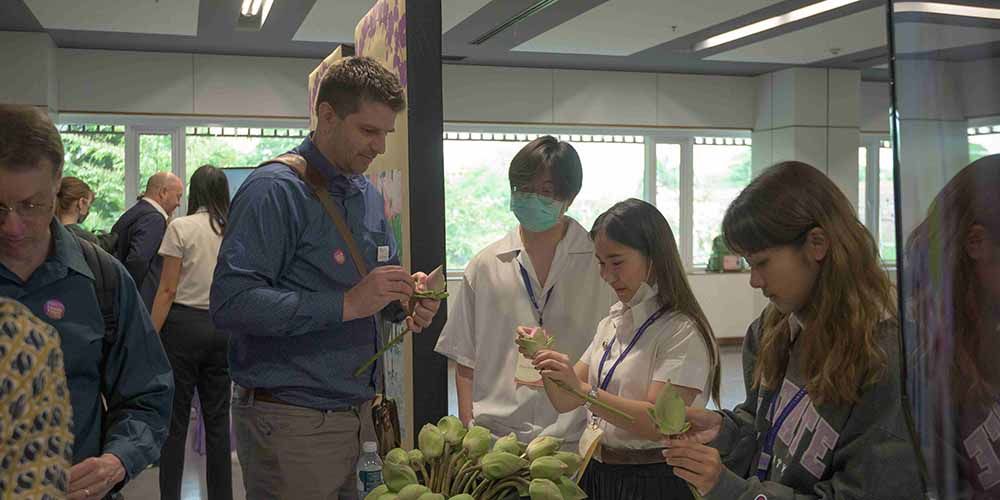 Following the Thai dance performances, the guests were given a guided tour of MUIC facilities and of Mahidol University’s Salaya campus. Coming back from the tour, they were treated to a lunch of Thai cuisine followed by a Thai floral arts workshop where the guests were introduced to basic Thai floral arrangement in a workshop. The guests enjoyed the workshop saying it allowed them to relax and be prepared for their participation in the APAIE Conference held in Queen Sirikit National Convention Center from March 13 to 17, 2023.