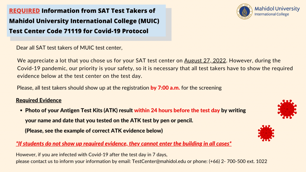 MUIC SAT test center will operate SAT test center on August 27, 2022 by following Covid-19 prevention protocol. All test takers should show up at the registration by 7:00 a.m. The test center requires the following evidence from all test takers
