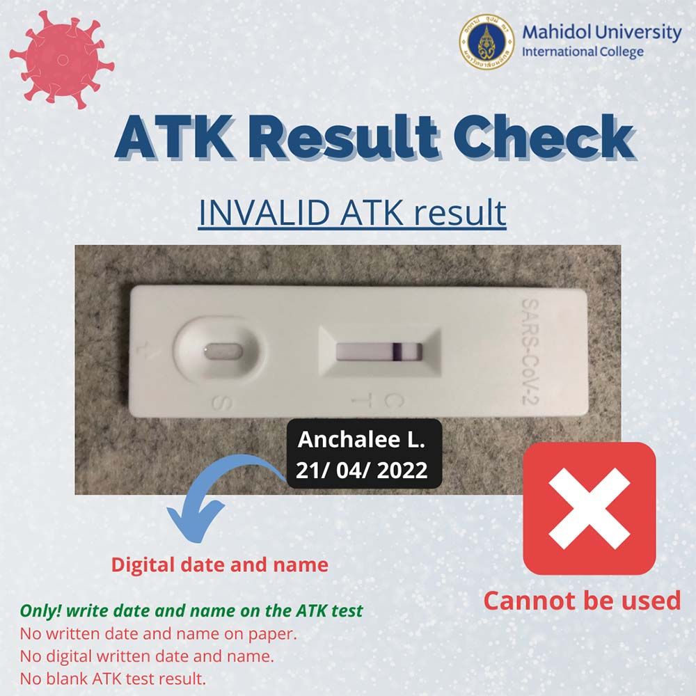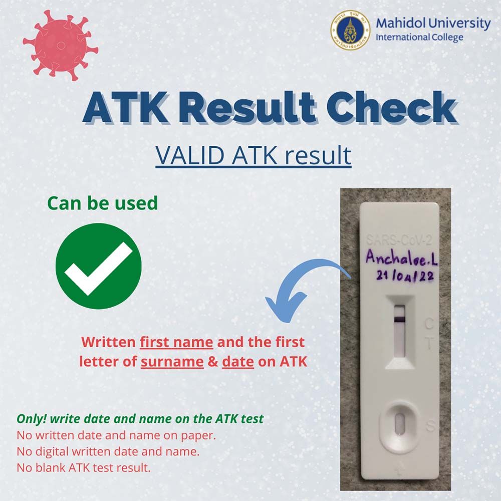 - Photo of your Antigen Test Kits (ATK) result within 24 hours before the test day by writing your name and date that you tested on the ATK test by pen or pencil. (Please, see the example of the correct ATK evidence below)