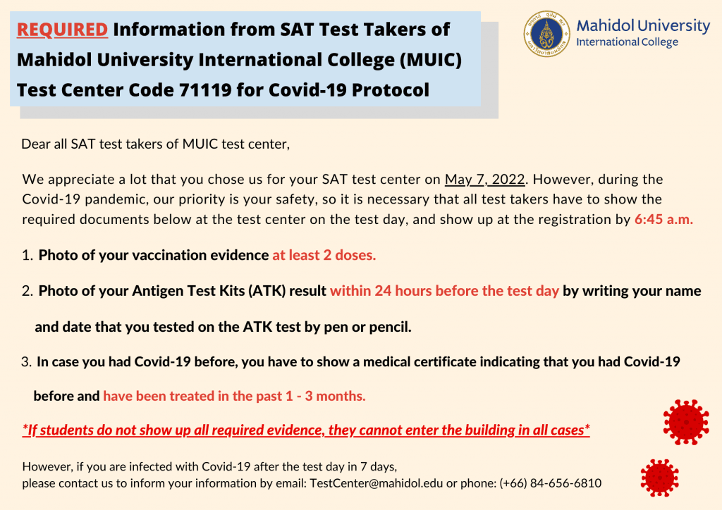 MUIC SAT test center will operate SAT test center on May 7, 2022 by following Covid-19 prevention protocol. All test takers should show up at the registration by 6:45 a.m. The test center requires the following evidence from all test takers
