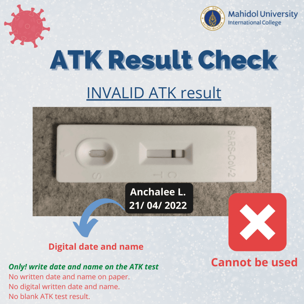 2. Photo of your Antigen Test Kits (ATK) result within 24 hours before the test day by writing your name and date that you tested on the ATK test by pen or pencil.