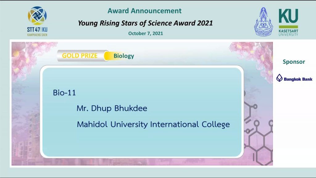 Mr. Dhup Bhukdee, majoring in Biological Science whose senior research project is entitled “Improved Colorectal Cancer Subtyping with Machine Learning and Bioinformatics Analysis;” and