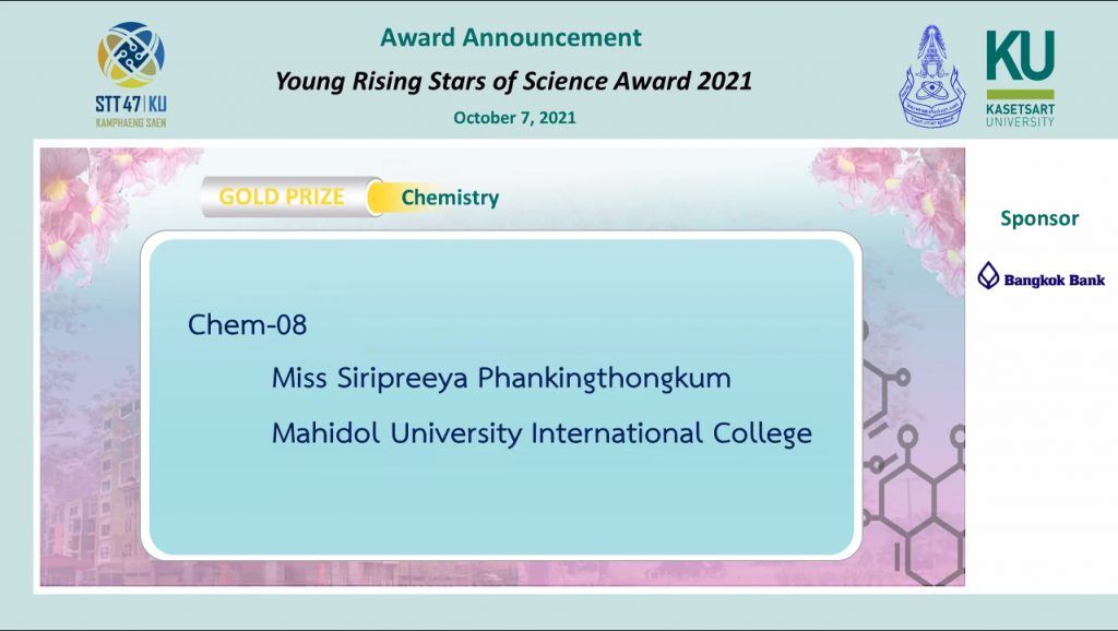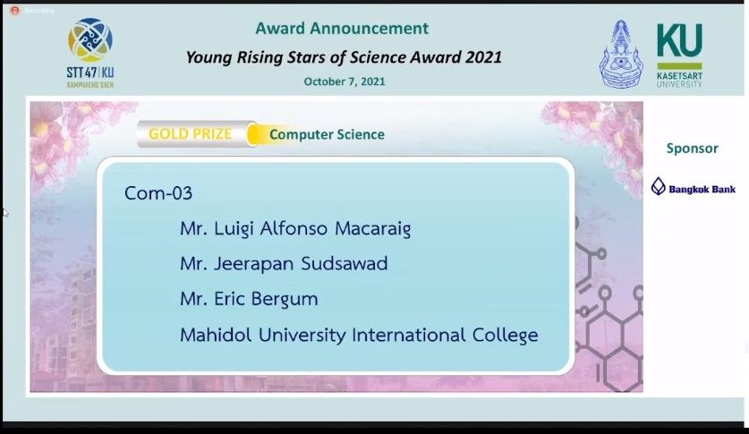 Five students of Mahidol University International College (MUIC) received the Young Rising Stars of Science Award 2021(Gold Prize) for their respective senior research projects in the 47th International Congress on Science, Technology and Technology-based Innovation held online and at Kasetsart University Kamphaeng Saen Campus on October 5-7, 2021.