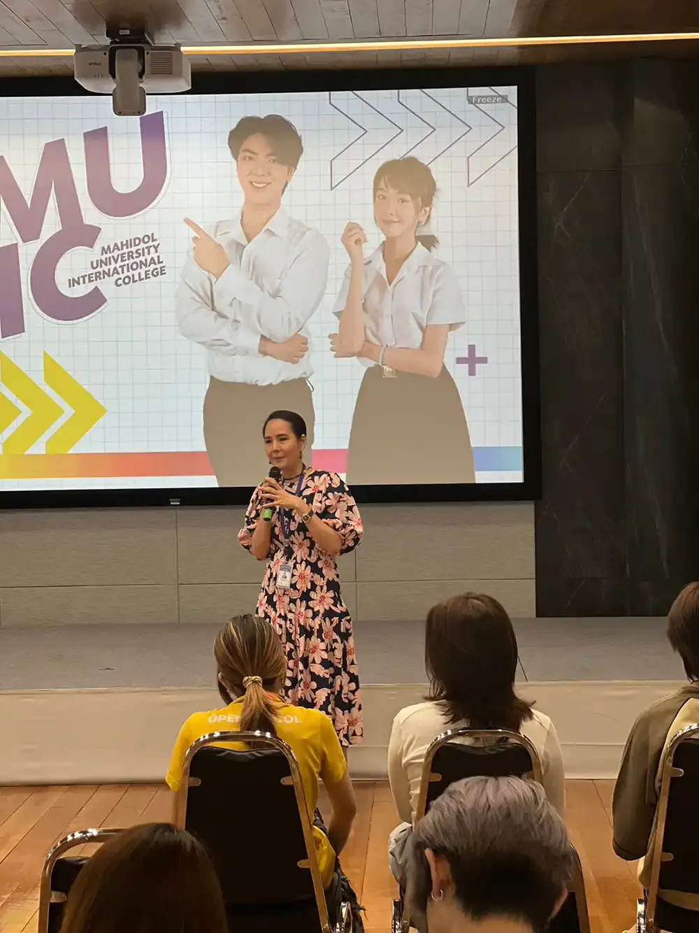 Along with MUIC staff members and current students, several faculty members met with the visitors at Charinyarasami Hall, Aditayathorn Building including Dr. Bryan Edward Ott, Chairperson of the Fine and Applied Arts (FAA) Division, his colleagues Dr. Jerimiah Morris of the Media and Communication Program, and Ajarn Ploy Nikadanont of the Communication Design Program; along with Asst. Prof. Dr. Malinvisa Sakdiyakorn, a faculty member of the Business Administration (BA) Division.