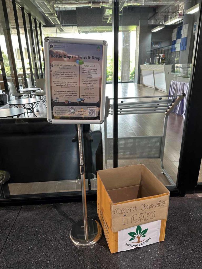 From February 6 - March 10, 2023, the club set up donation boxes in front of Termtem Room in Aditayathorn Building, and in front of the elevator bank of Building 1 where participants can drop off the bottle caps they were donating.