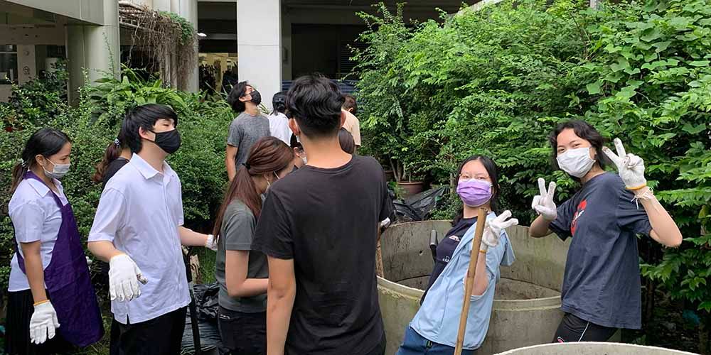 The MUIC Grounds and Operations Section (under their Chief, Khun Sitta Kutsang) installed eight large-scale composting bins in July behind Building 1; now students led by the Nature Lovers and Science Society Clubs are joining hands with the professional staff to fill them up. Funding from the Student Affairs Office for this project is also a much welcome support.