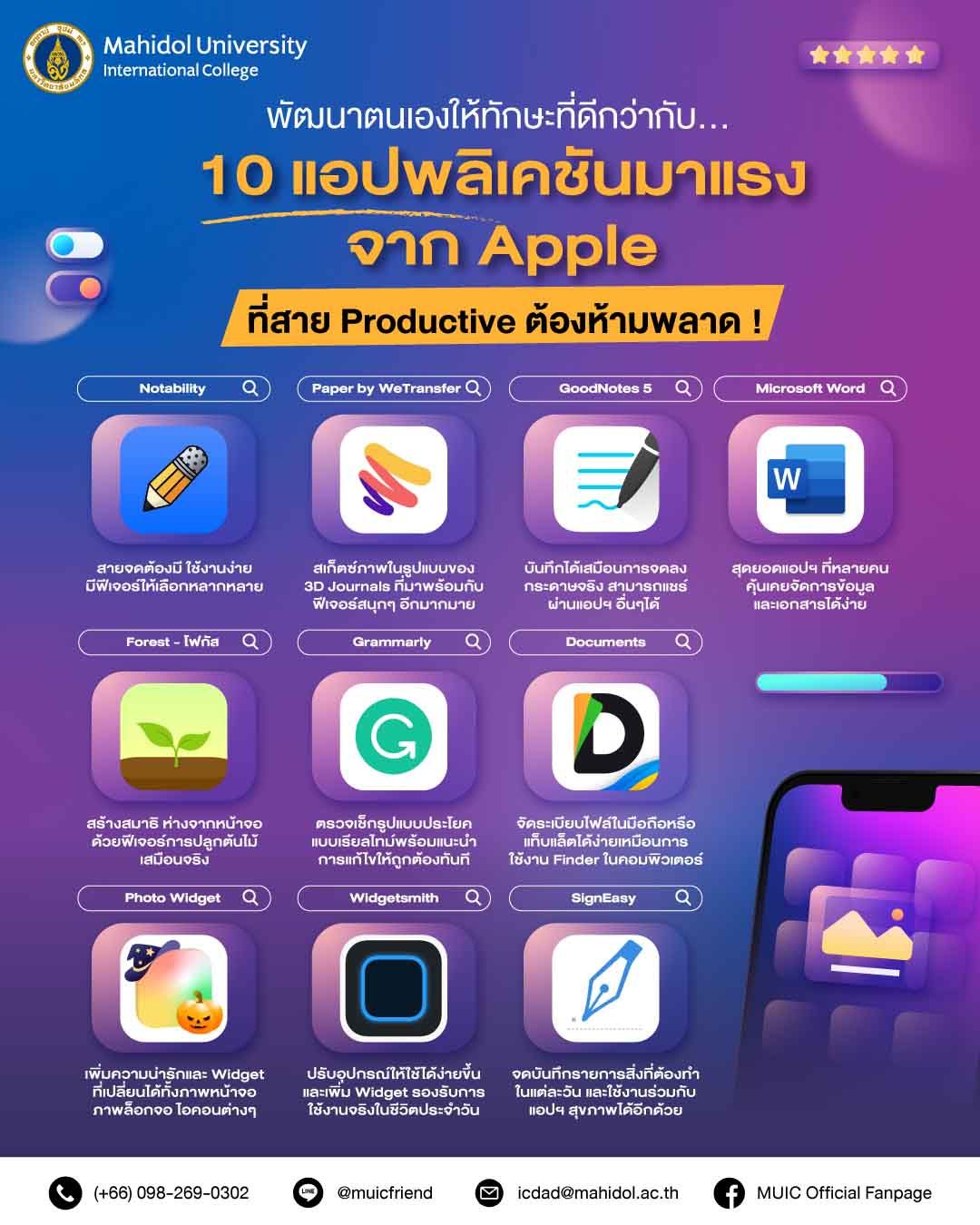 วันนี้ MUIC จะพาทุกคนมาพัฒนาตนเองผ่านแอปพลิเคชันทั้ง 10 แอปฯ ซึ่งจัดอันดับโดย Apple เพื่อให้น้องๆ นักเรียนนักศึกษาได้พัฒนาตัวเองและช่วยอำนวยความสะดวกในการเรียนได้ดียิ่งขึ้น! จะมีแอปพลิเคชันไหนบ้างไปดูกัน