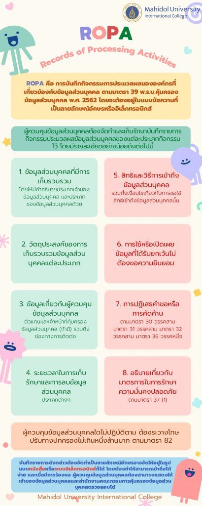 ROPA คือ การบันทึกกิจกรรมการประมวลผลขององค์กรที่เกี่ยวข้องกับข้อมูลส่วนบุคคล ตามมาตรา 39 พ.ร.บ.คุ้มครองข้อมูลส่วนบุคคล พ.ศ. 2562 โดยจะต้องอยู่ในแบบข้อความที่เป็นลายลักษณ์อักษรหรืออิเล็กทรอนิกส์