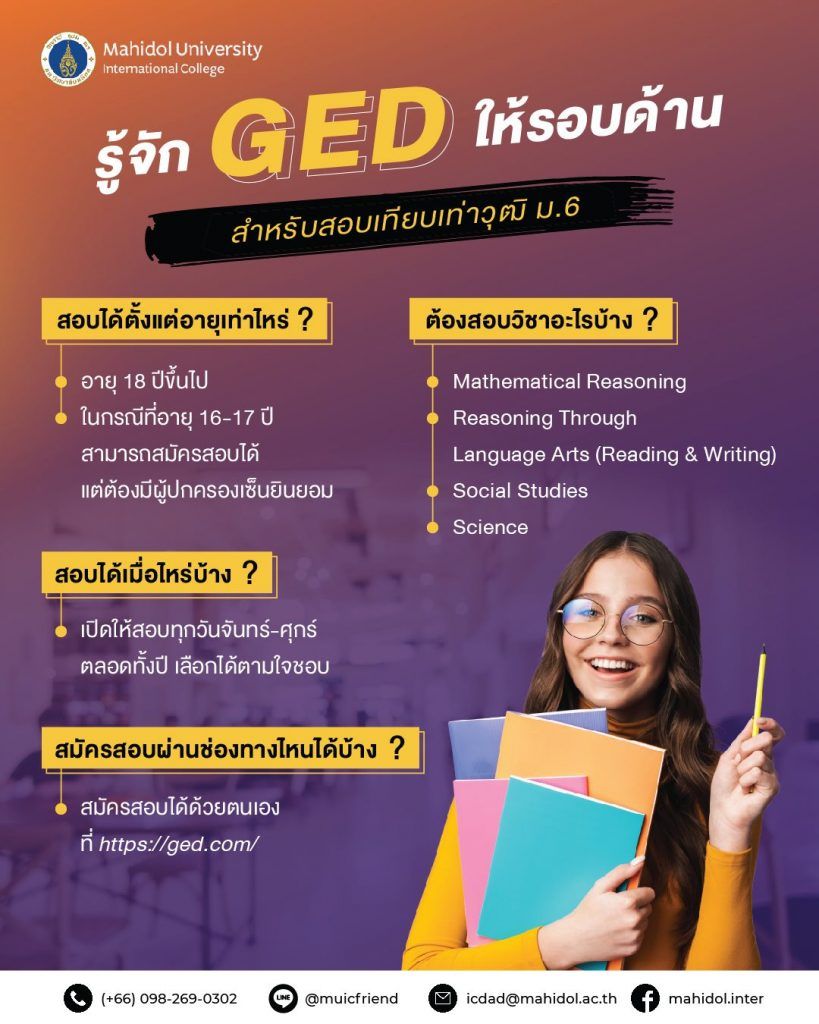 น้องๆ อายุระหว่าง 16 - 18 ปี คนไหนที่อยากเข้ามหาวิทยาลัย ทาง MUIC ก็ขอพาน้องๆ ไปทำความรู้จักกับการสอบ GED (General Educational Development) หรือการสอบเทียบวุฒิมัธยมศึกษาตอนปลาย(ม.6) ตามหลักสูตรของ #สหรัฐอเมริกา ที่ผู้สอบผ่านสามารถใช้ประกาศนียบัตรสมัครเข้าเรียนในระดับอุดมศึกษาได้ทั้งในและต่างประเทศนั่นเอง!