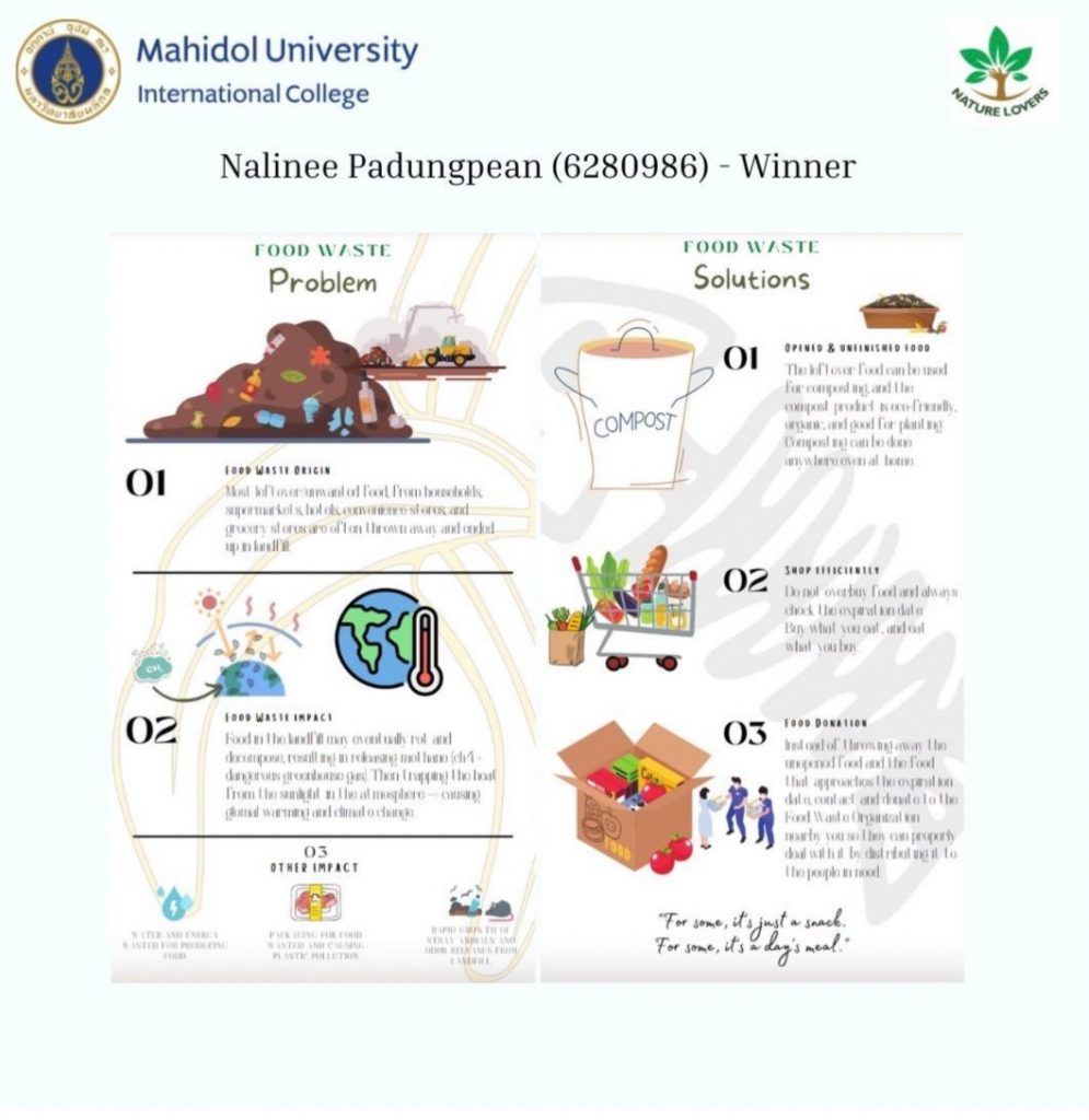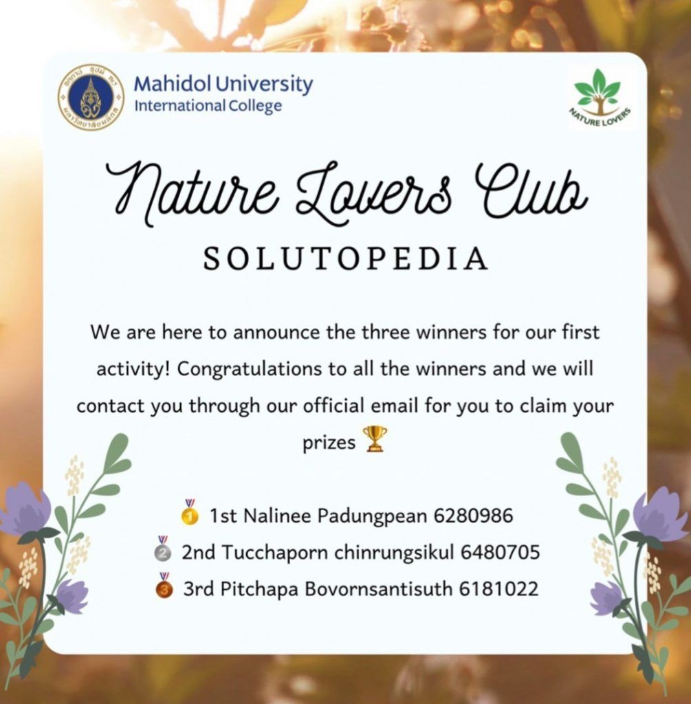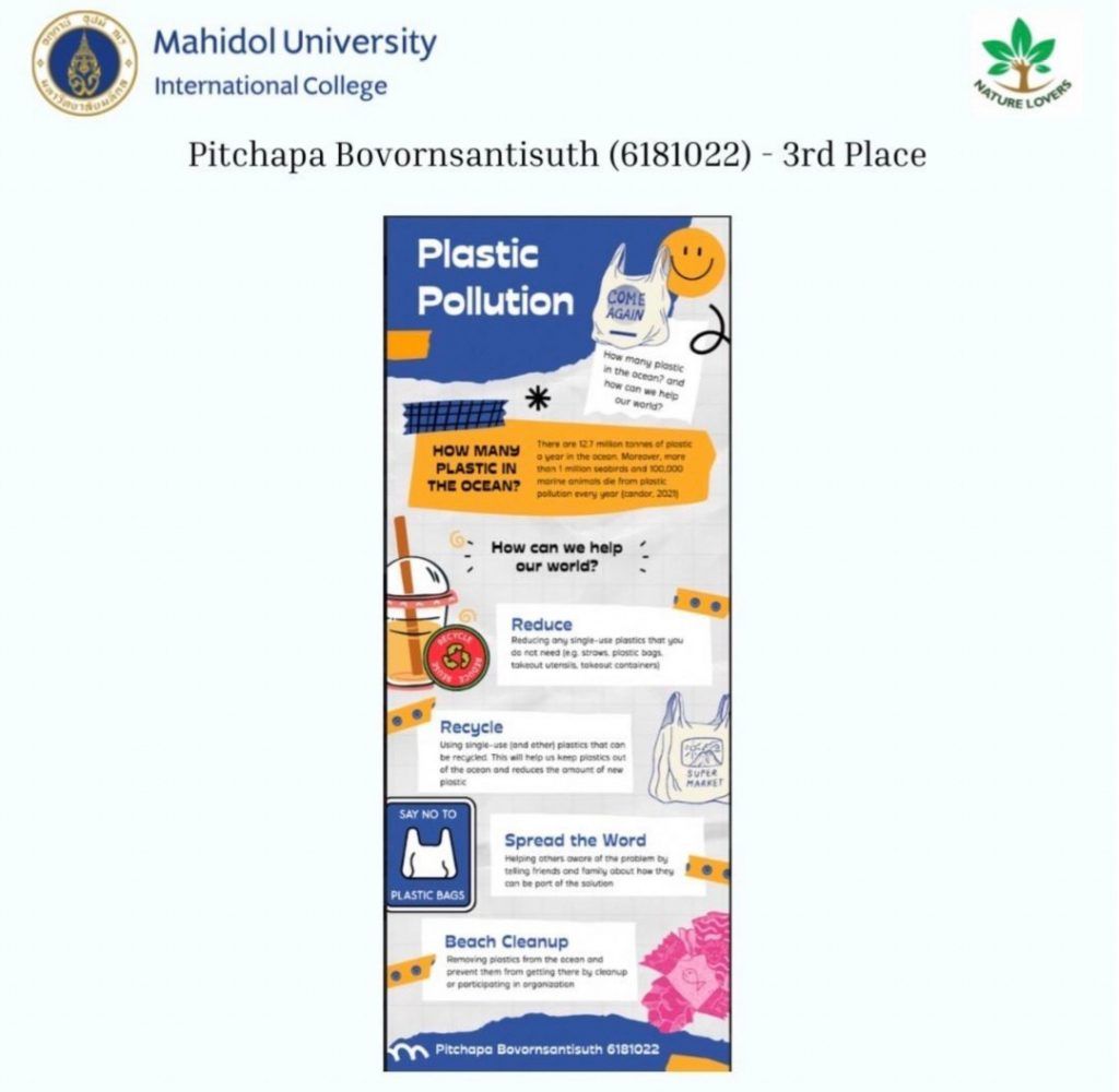 The winners were Nalinee Padungpean (1st Place, 1,000 Baht cash prize), Tucchaporn Chinrungsikul (2nd Place, 700 Baht cash prize) and Pitchapa Bovornsantisuth (3rd Prize, 500 Baht cash prize). Every contestant also received 3 AT Hours under Environmental Literacy.