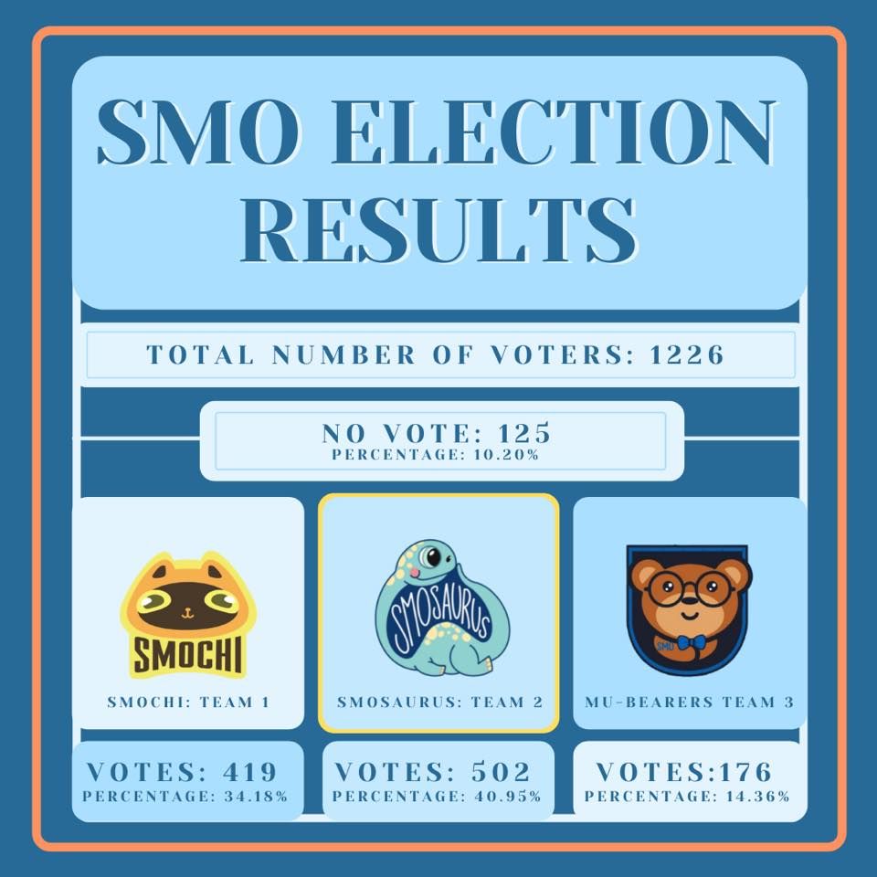 The results of the online election held on July 31 - August 1, 2021 showed that out of the 1,226 students who voted, Smosaurus garnered 502 votes. Smochi team received 419 votes while MU-Bearers team collected 176 votes.