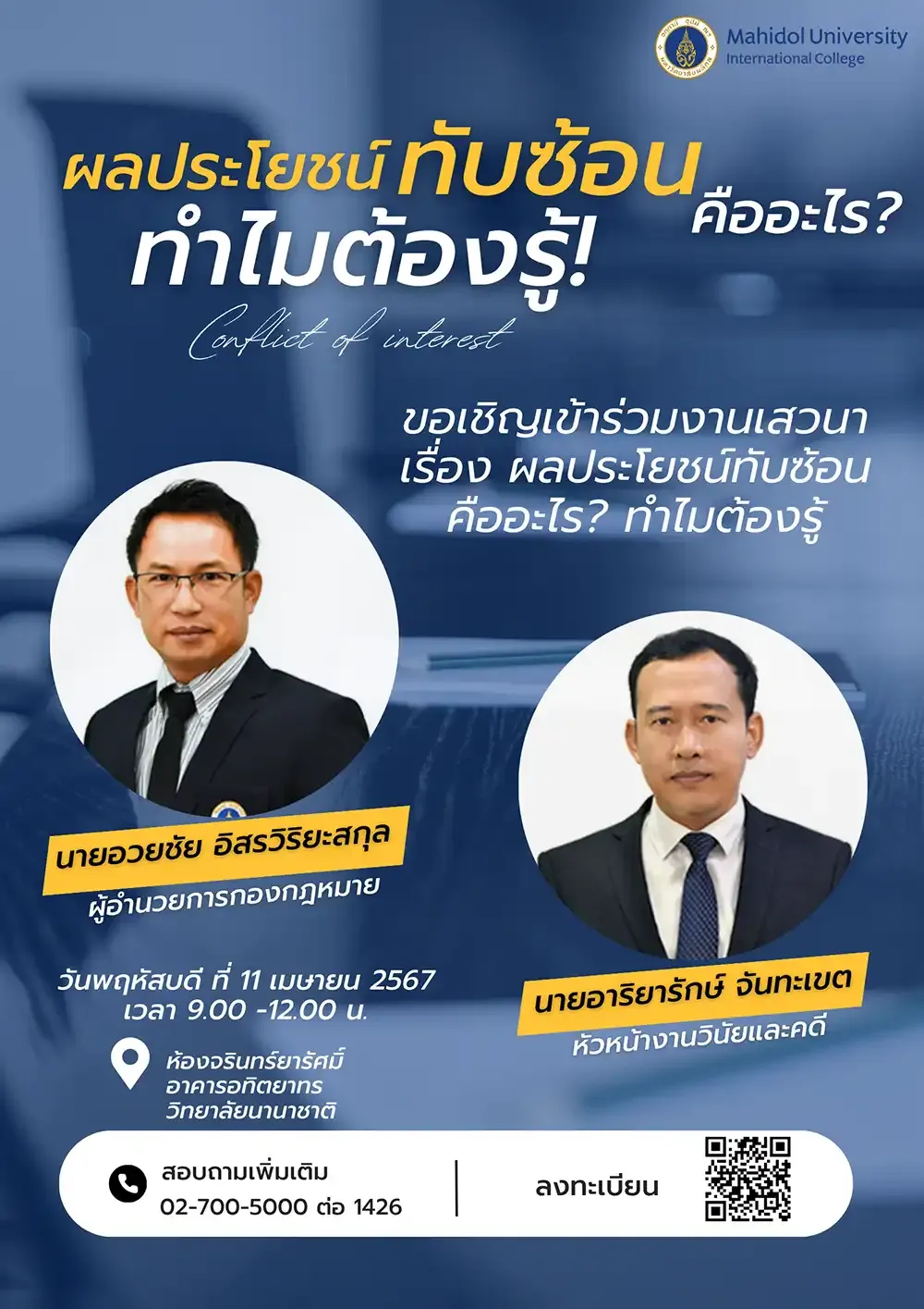 เมื่อวันพฤหัสบดี ที่ 11 เมษายน 2567 วิทยาลัยนานาชาติ มหาวิทยาลัยมหิดล ได้จัดงานเสวนา เรื่อง ผลประโยชน์ทับซ้อนคืออะไร? ทำไมต้องรู้! (Conflict of interest) ณ ห้องจรินทร์ยารัศมิ์ อาคารอทิตยาทร วิทยาลัยนานาชาติ ตั้งแต่เวลา 9.00 – 12.00 น. โดยได้เชิญวิทยากรผู้เชี่ยวชาญ นายอวยชัย อิสรวิริยะสกุล ผู้อำนวยการกองกฎหมาย มหาวิทยาลัยมหิดล และนายอาริยารักษ์ จันทะเขต หัวหน้างานวินัยและคดี กองกฎหมาย มหาวิทยาลัยมหิดล มาร่วมพูดคุยแลกเปลี่ยนเรียนรู้ ซึ่งได้ให้ความรู้เกี่ยวกับผลประโยชน์ทับซ้อนรวมถึงยกกรณีตัวอย่างที่เกิดขึ้นเพื่อให้บุคลากรได้มีความตระหนักรู้และพึงระวังเกี่ยวกับผลประโยชน์ส่วนรวมและผลประโยชน์ส่วนตนมากขึ้น ภายในงานมีบุคลากรของวิทยาลัยนานาชาติเข้าร่วมกิจกรรมทั้งสิ้น 55 คน